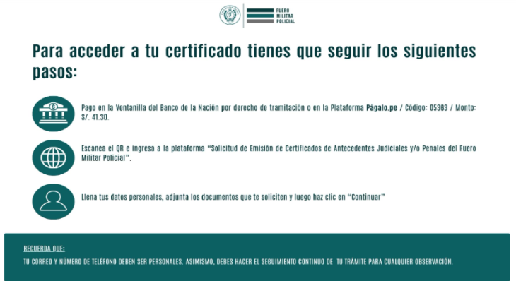 Para obtener el certificado, el usuario debe realizar un pago de S/ 41.30 a través de Págalo.pe o en las agencias del Banco de la Nación, y posteriormente ingresar a la plataforma virtual del FMP para registrar sus datos, cargar los documentos solicitados y hacer seguimiento a su solicitud desde cualquier dispositivo con Internet.