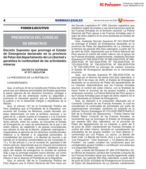 La provincia de Pataz se mantuvo en estado de emergencia de manera continua desde el 13 de febrero de 2024, acumulando al año 2025 más de 22 meses bajo esta medida excepcional. La decisión respondió al incremento sostenido de delitos graves vinculados a la minería ilegal, tales como asesinatos, secuestros, atentados con explosivos y enfrentamientos armados.