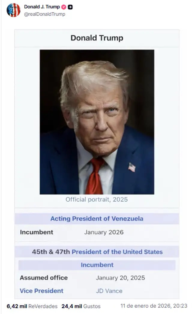 El mandatario de Estados Unidos, Donald Trump, causó revuelo tras difundir en Truth Social una imagen manipulada que simulaba una entrada de Wikipedia donde se le adjudica el cargo de “presidente interino de Venezuela”. La imagen, creada mediante edición digital, no refleja ninguna modificación real del sitio web, que continúa identificándolo únicamente como presidente estadounidense.
