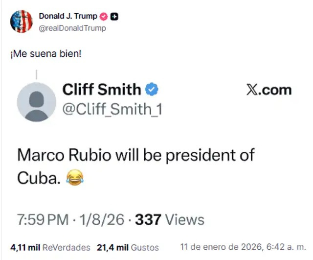 La controversia se amplió cuando el presidente replicó un mensaje que sugería al secretario de Estado, Marco Rubio, como “presidente de Cuba”, acompañándolo con un emoji de risa y la frase “Sounds good to me!”. El gesto fue leído como otra muestra del tono provocador del mandatario, mientras Rubio evitó pronunciarse públicamente.