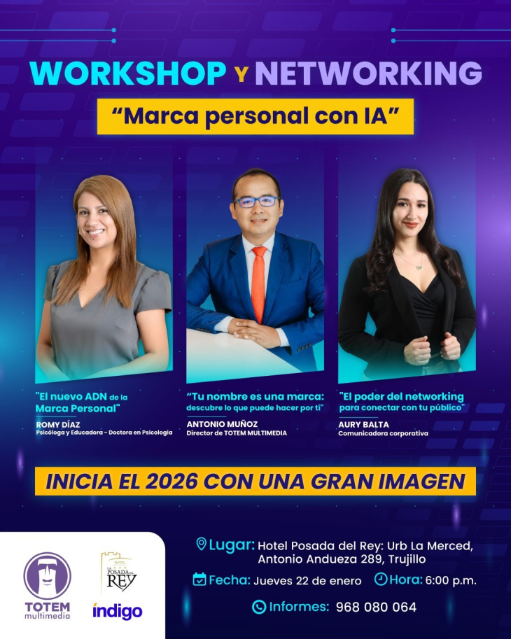 Con el objetivo de fortalecer la imagen profesional y mejorar la empleabilidad en un mercado cada vez más competitivo, este jueves 22 de enero se realizará en Trujillo el Workshop & Networking “Marca Personal con Inteligencia Artificial”, un evento presencial que reunirá a especialistas en comunicación, psicología y networking, organizado por Totem Multimedia.