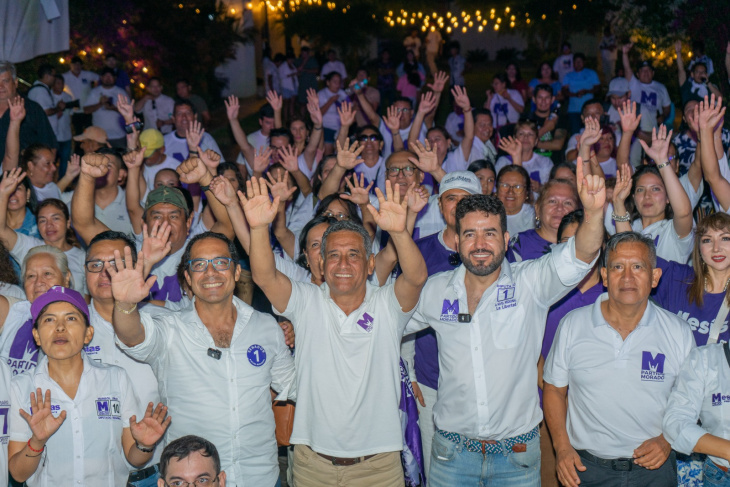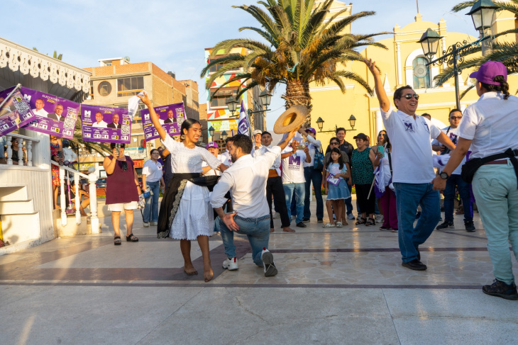 Posteriormente, la comitiva se trasladó distrito de Moche, donde el candidato presidencial y su equipo caminaron por diversas calles, saludando de manera cercana y afectuosa a los vecinos. El recorrido continuó hasta la Plaza de Armas de Moche, donde se vivió un ambiente festivo marcado por la participación ciudadana. En este punto, Alan Alcalde, candidato con el número 1 a diputado, sorprendió al público al bailar marinera, generando entusiasmo entre los asistentes, mientras que Mesías Guevara y otros integrantes del equipo se sumaron con danzas tradicionales como el huayno.