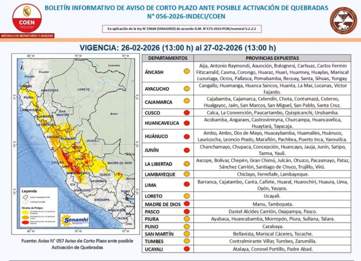 Un total de 49 provincias distribuidas en ocho departamentos han sido catalogadas con nivel de riesgo muy alto ante la probabilidad de activación de quebradas, deslizamientos y crecidas de ríos. La alerta fue emitida tras los últimos reportes técnicos del Servicio Nacional de Meteorología e Hidrología del Perú, que anticipan lluvias de moderada a fuerte intensidad en amplias zonas del territorio nacional.
